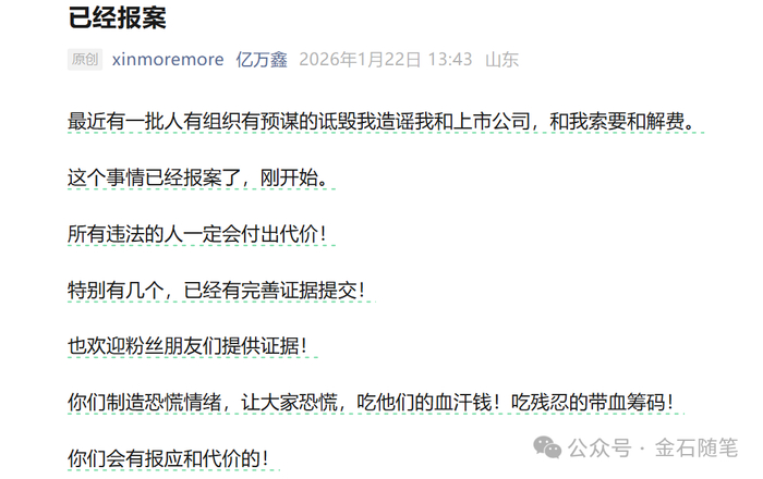 就在刚刚,他再度报案:最近有一批人有组织有预谋的诋毁我造谣我和上市公司,和我索要和解费,已经报案了。你们制造恐慌情绪,让大家恐慌,吃他们的血汗钱!吃残忍的带血筹码!你们会有报应和代价的!