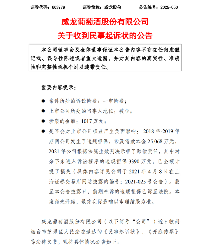 10月9日,威龙葡萄酒股份有限公司(下称“威龙股份”)发布公告显示,公司近日收到烟台市芝罘区人民法院送达的《民事起诉状》、《开庭传票》等法律文书,因一起担保纠纷被诉至法院,原告要求公司就一笔历史债务承担1017万元的补充赔偿责任。
