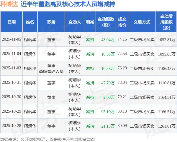 科博达:11月5日高管柯炳华减持股份合计43.04万股