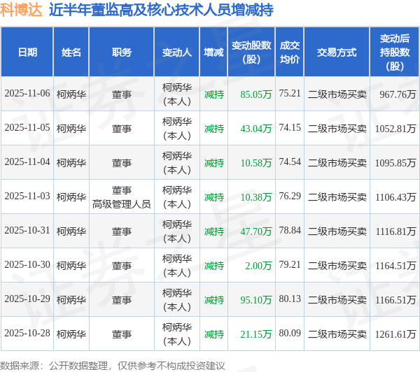 科博达:11月6日高管柯炳华减持股份合计85.05万股
