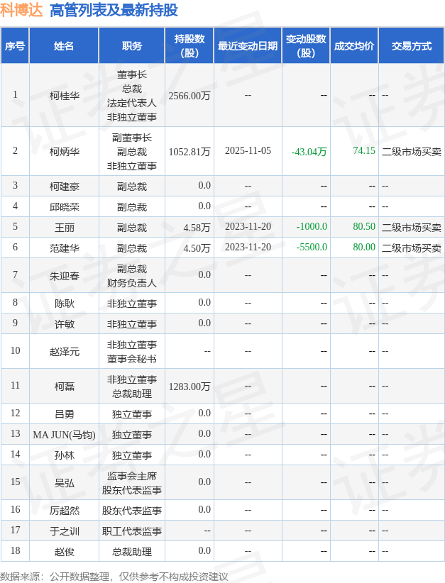 科博达近半年内的董监高及核心技术人员增减持详情如下: