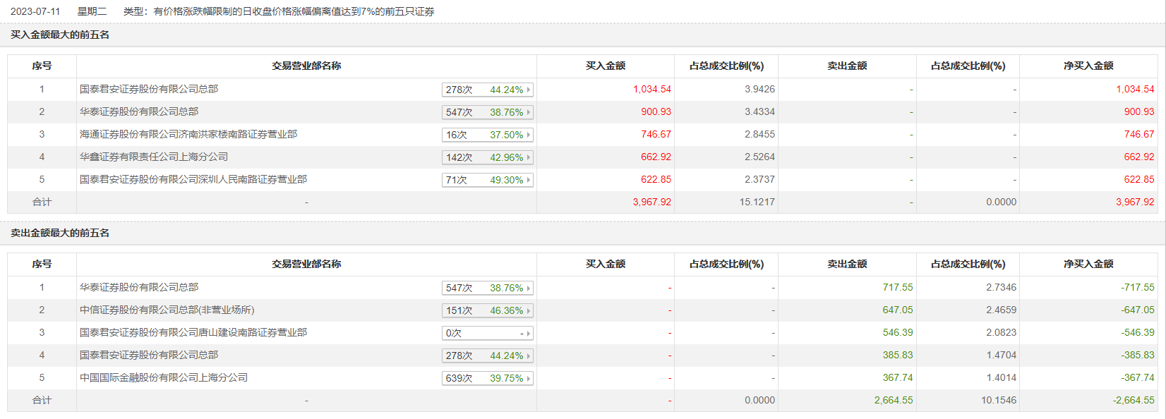 具体来看,国泰君安证券总部、华泰证券总部分别买入1034.54万元、900.93万元;华泰证券总部、中信证券总部(非营业场所)分别卖出717.55万元、647.05万元。