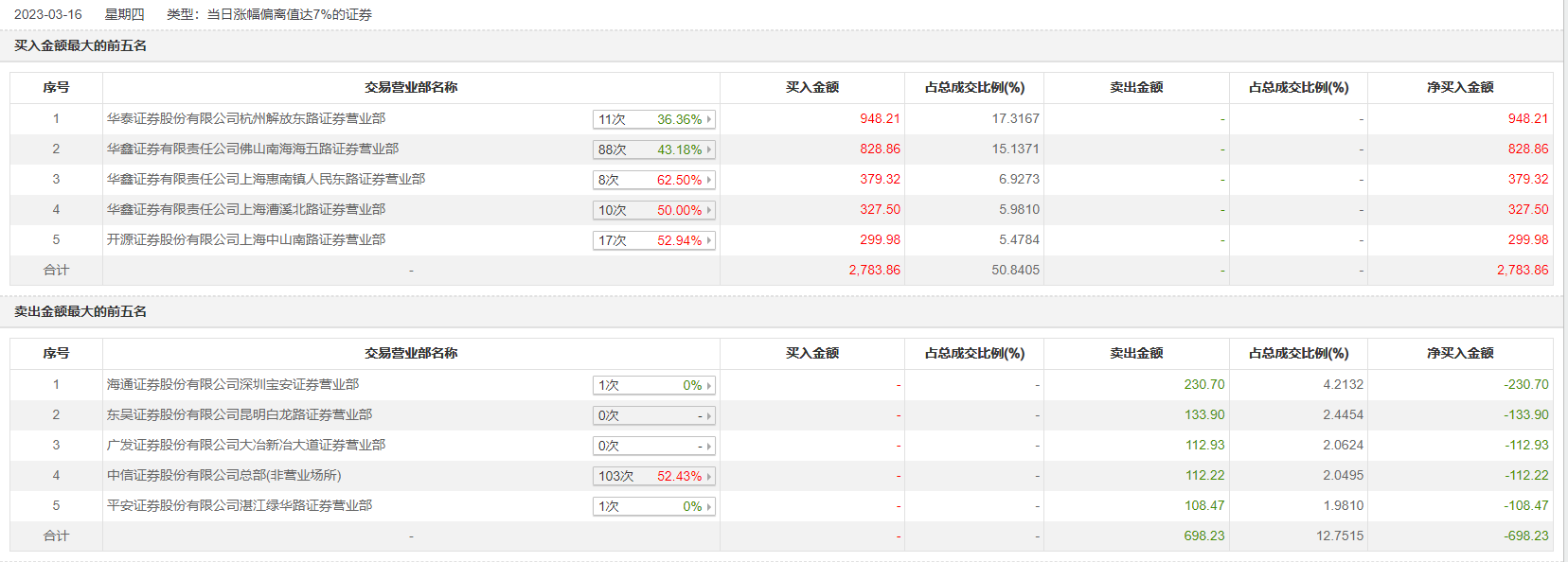 具体来看,华泰证券杭州解放东路证券营业部、华鑫证券佛山南海海五路证券营业部分别买入948.21万元、828.86万元;海通证券深圳宝安证券营业部、东吴证券昆明白龙路证券营业部分别卖出230.70万元、133.90万元。