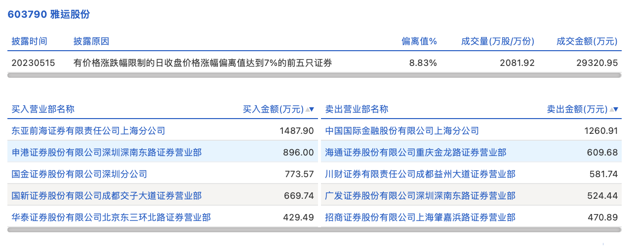 5月15日,雅运股份今日涨停,龙虎榜数据显示,上榜营业部席位全天成交7704.35万元,占当日总成交金额比例为26.28%。其中,买入金额为4256.69万元,卖出金额为3447.66万元,合计净买入809.04万元。