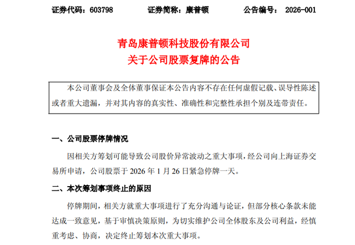 1月26日,康普顿(603798)因筹划重大事项紧急停牌一个交易日,晚间,康普顿便公告,公司决定终止筹划本次重大事项,公司股票自2026年1月27日(星期二)开市起复牌。