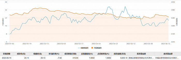 6月19日大宗交易成交415万股,成交额9603.1万元,占当日总成交额的52.2%,成交价23.14元,较市场收盘价25.13元折价7.92%。