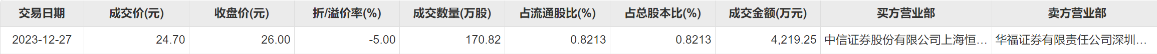 今日大宗交易成交170.82万股,成交额4219.25万元,占当日总成交额的44.66%,成交价24.7元,较市场收盘价折价5%。