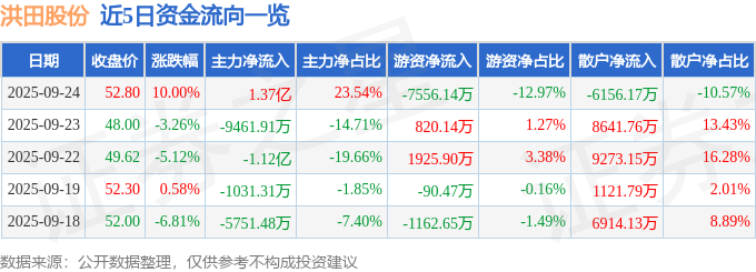 证券之星消息,洪田股份9月24日涨停收盘,收盘价52.8元。该股于10点15分涨停,未打开涨停,截止收盘封单资金为9083.18万元,占其流通市值0.83%。