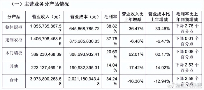 作为起家的核心品类,橱柜业务的下滑最为突出,成为拖累整体业绩的主要因素。2025年前三季度,整体橱柜业务营收同比下降36.47%,毛利率同步下滑2.76%,两项指标降幅均居各业务板块首位。值得注意的是,橱柜业务的行业地位持续弱化:2023年其营收占比首次跌破50%,2025年上半年规模被定制衣柜业务反超,退居公司第二大业务,标志着传统核心品类的增长引擎作用正式消退。