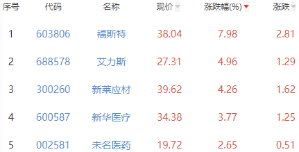 其中,福斯特、艾力斯、新莱应材、新华医疗和未名医药位列板块涨幅前五位,涨幅分别为7.98%、4.96%、4.26%、3.77%和2.65%。