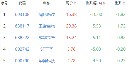 润达医疗、圣诺生物、成都先导、ST三圣和华神科技位列涨幅榜后五位,涨幅分别为-10.00%、-5.53%、-5.11%、-5.03%和-4.59%。