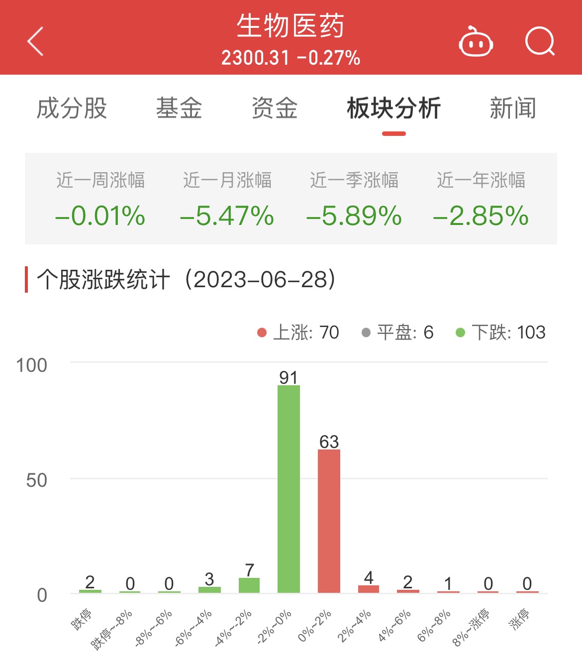 中国经济网北京6月28日讯今日,生物医药板块整体涨幅-0.27%,其中70只股票上涨,6只股票平盘,103只股票下跌。