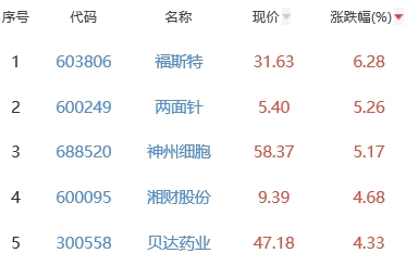 其中,福斯特、两面针、神州细胞、湘财股份、贝达药业位列板块涨幅前五位,涨幅分别为6.28%、5.26%、5.17%、4.68%、4.33%。