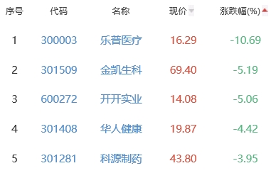 乐普医疗、金凯生科、开开实业、华人健康、科源制药位列涨幅榜后五位,涨幅分别为-10.69%、-5.19%、-5.06%、-4.42%、-3.95%。