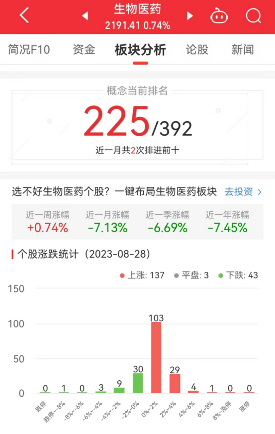 中国经济网北京8月28日讯今日,生物医药板块整体涨幅0.74%,其中137只股票上涨,3只股票平盘,43只股票下跌。