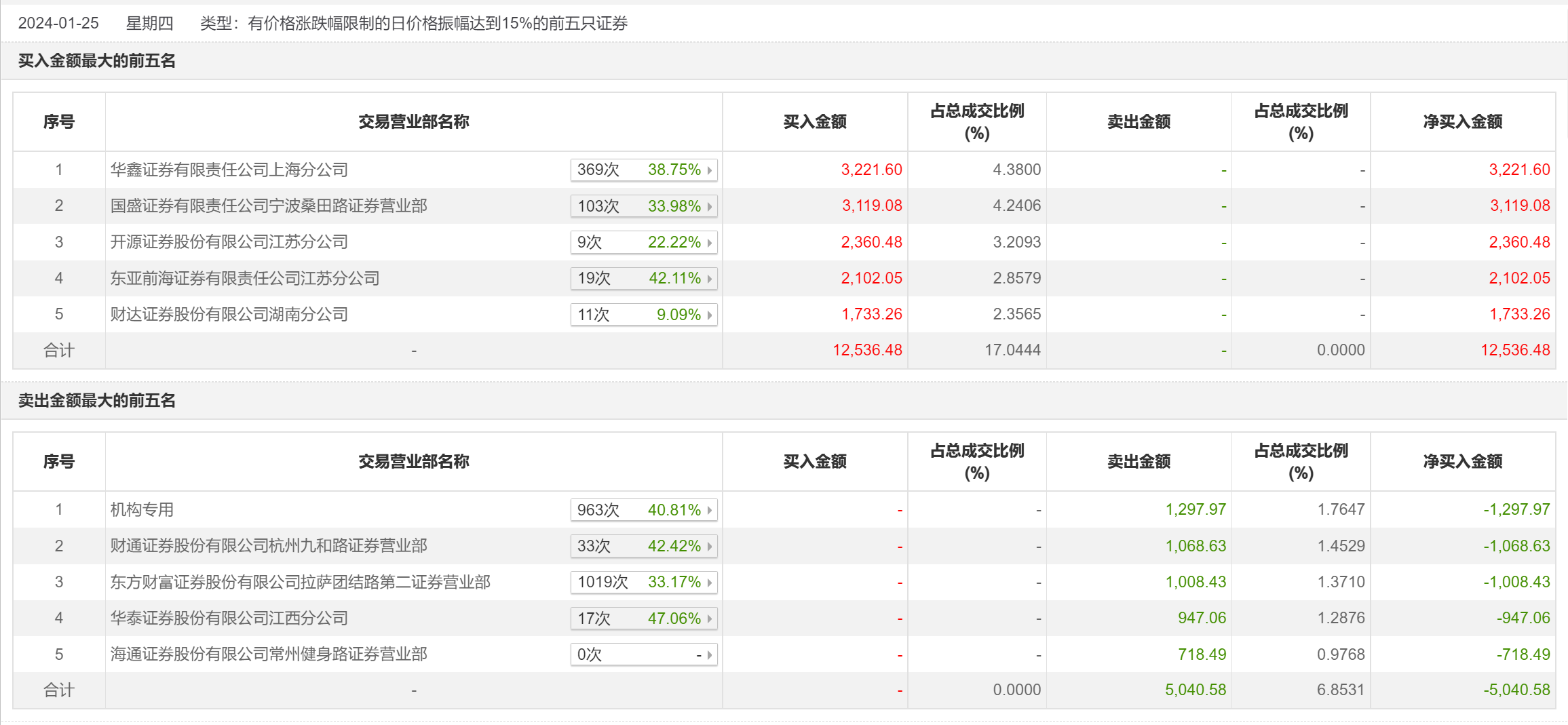 龙虎榜丨丰山集团今日涨停,机构净卖出1297.97万元