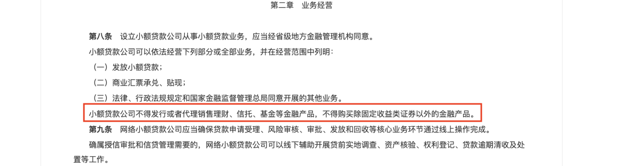 财闻注意到,这一《小额贷款公司监督管理暂行办法》于2024年12月底发布。文件显示,“小额贷款公司不得发行或者代理销售理财、信托、基金等金融产品,不得购买除固定收益类证券以外的金融产品。”