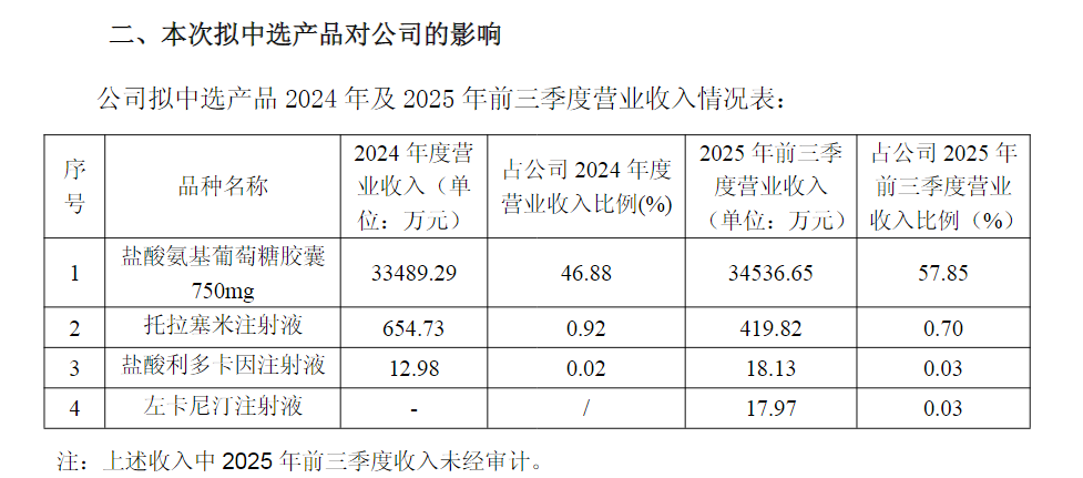 该产品近年来销售景气,增势明显。据披露,诚意药业的关节类药物自2020年国采中标后,以每年10%以上的增速稳步增长。2024年度,公司的盐酸氨基葡萄糖胶囊实现营收3.35亿元,占公司2024年营收的46.88%。2025年前三季度,该产品实现销售3.45亿元,超过2024年全年水平,占诚意药业前三季度的营收比重达到57.85%。