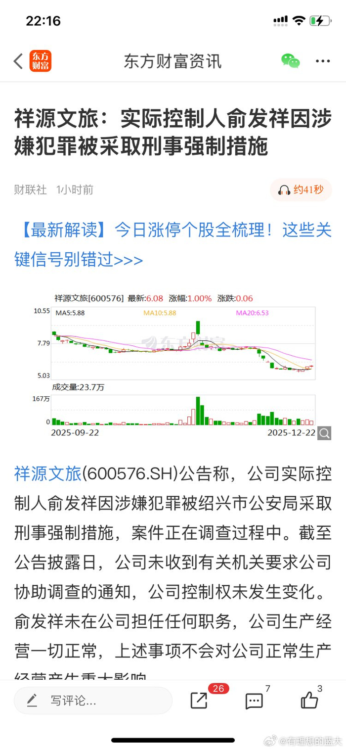 祥源文旅:实际控制人俞发祥因涉嫌犯罪被采取刑事强制措施
