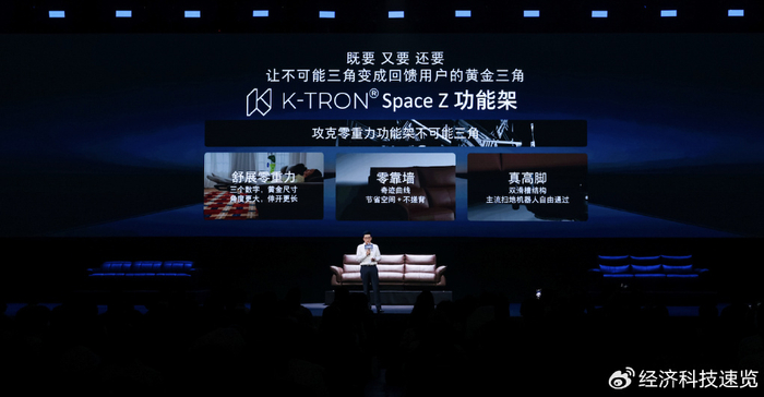 发布会上,顾家主要从两大核心设计切入解析K-TRONSpace Z功能架的技术突破,其中“双滑槽结构”在实现沙发轻薄化与承托稳定的同时,还满足了“零重力”“零靠墙”与“真高脚”的协同适配,能够适配行业主流扫地机器人自由进出打扫消除家居卫生死角的痛点。“奇迹曲线”则针对性地解决了高靠背、大角度下的零靠墙问题,彻底解决传统电动沙发“难摆放、伤墙面”的痛点。