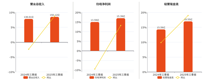 公司营业总收入为150.12亿元。归母净利润为15.39亿元。经营活动现金净流入为18.55亿元。