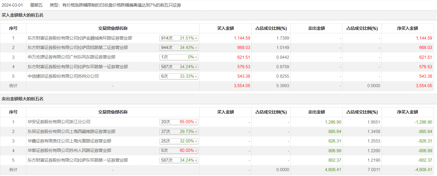 具体来看,华安证券浙江分公司、东吴证券上海西藏南路证券营业部分别卖出1286.90万元、885.84万元;东方财富证券拉萨金融城南环路证券营业部、东方财富证券拉萨团结路第二证券营业部分别买入1144.59万元、668.03万元。