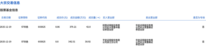 12月19日,ST华扬大宗交易成交81.72万股,成交额721.72万元,占当日总成交额的24.71%,成交均价8.83元,较市场收盘价8.86元折价0.32%,其中最高成交价8.86元,最低成交价8.8元。