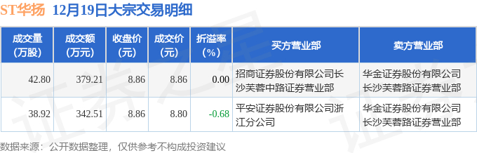 12月19日ST华扬发生2笔大宗交易 成交金额721.72万元