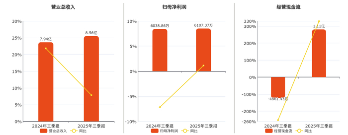 公司营业总收入为8.56亿元。归母净利润为6107.37万元。经营活动现金净流入为1.11亿元。