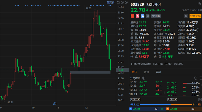格隆汇12月25日|洛凯股份(603829.SH)再度下跌超8%,现报22.7元刷新近期调整低价,该股自12月12日创新高以来持续下跌,区间跌幅超30%,最新市值42.1亿元。
