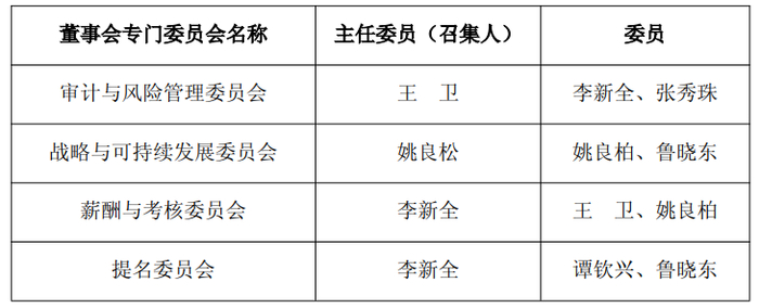 董事会成员包括董事长姚良松、副董事长谭钦兴和姚良柏,以及职工代表董事张秀珠和独立董事李新全、鲁晓东、王卫。董事会下设审计与风险管理委员会、提名委员会、薪酬与考核委员会、战略与可持续发展委员会四个专门委员会。具体组成如下: