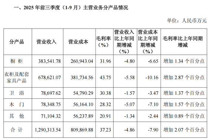 公司经营数据显示,今年前三季度,欧派家居所有主要业务板块均增长乏力。其衣柜及配套家具产品、橱柜业务两大核心业务合计营收占比超过八成,但前者营收同比下降5.58%,后者下降4.8%。此外,卫浴、木门及其他业务的收入也均出现下滑。