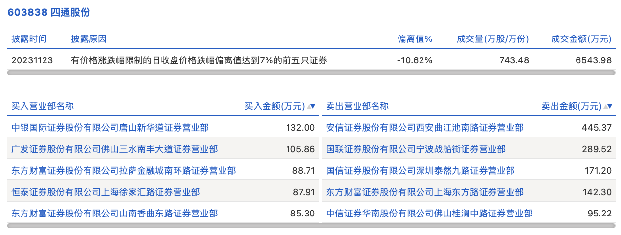 11月23日,四通股份今日跌停,全天换手率达2.32%,振幅达1.53%。龙虎榜数据显示,营业部席位合计净卖出643.82万元。其中,安信证券西安曲江池南路证券营业部、国联证券宁波战船街证券营业部分别卖出445.37万元、289.52万元;中银国际证券唐山新华道证券营业部、广发证券佛山三水南丰大道证券营业部分别买入132.00万元、105.86万元。