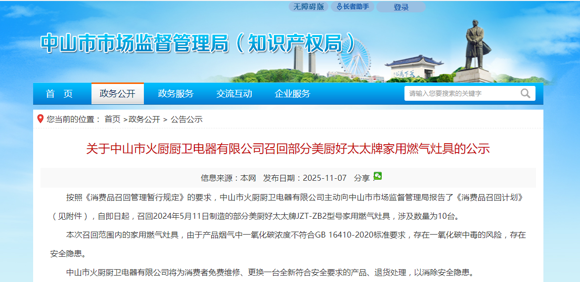 中山市火厨厨卫电器有限公司召回部分美厨好太太牌家用燃气灶具