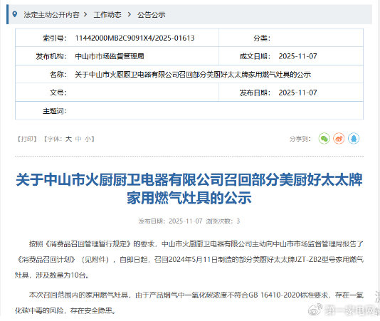 乐居财经 李兰 11月7日,佛山市灶宝电器科技有限公司(以下简称“灶宝电器”)主动向中山市市场监督管理局报告了《消费品召回计划》,召回2024年5月11日制造的部分美厨好太太牌JZT-ZB2型号家用燃气灶具,涉及数量为10台。