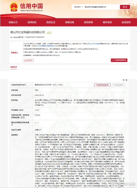灶宝电器曾遭行政处罚,行政处罚决定文书号为粤佛顺容市监行罚罚字﹝2025﹞158号。