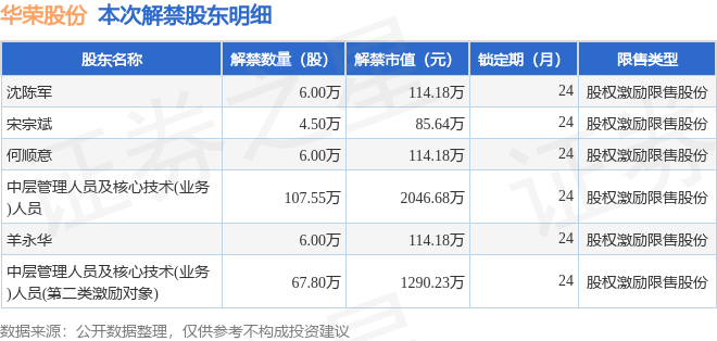 华荣股份(603855)197.85万股限售股将于12月1日解禁,占总股本0.59%