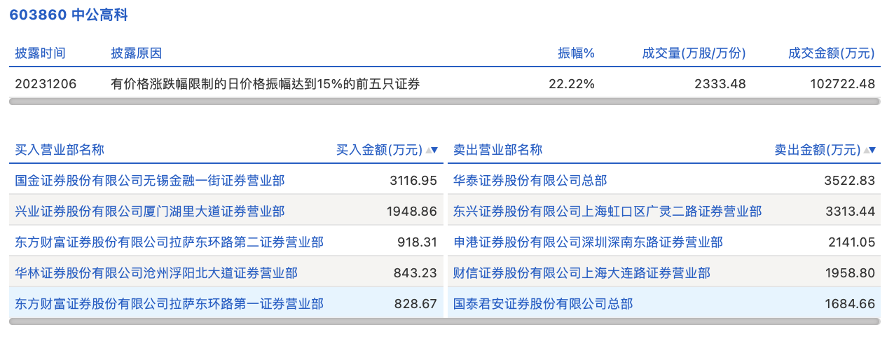12月6日,中公高科今日跌停,全天换手率达35%,振幅达22.22%。龙虎榜数据显示,营业部席位合计净卖出4964.76万元。其中,华泰证券总部、东兴证券上海虹口区广灵二路证券营业部分别卖出3522.83万元、3313.44万元;国金证券无锡金融一街证券营业部、兴业证券厦门湖里大道证券营业部分别买入3116.95万元、1948.86万元。