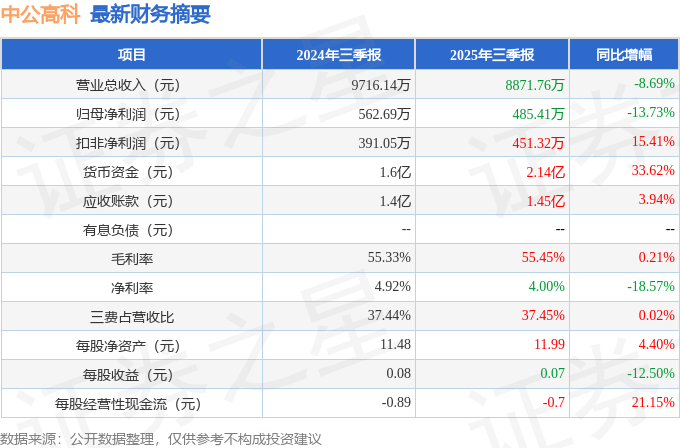 中公高科(603860)2025年三季报简析:净利润同比下降13.73%,公司应收账款体量较大