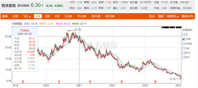 二级市场似乎对桃李面包近三年的情况并不满意。从2021年起,桃李面包的股价从每股24元一路下跌至最新的每股6.3元。