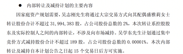 因家庭资产规划需要,吴志刚将通过大宗交易方式向其配偶盛雅莉转让股份合计不超过3199.44万股,占公司股份总数的2%,本次转让系控股股东及实际控制人之间的内部转让,不涉及向市场减持。