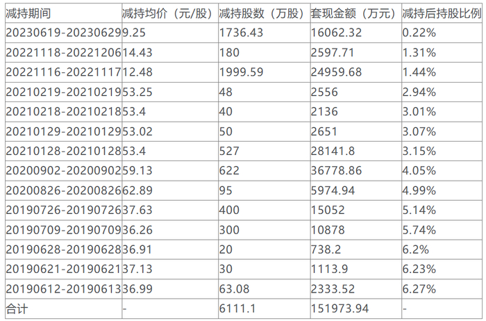2023年6月19日至2023年6月29日,减持1736.43万股,减持套现金额为1.61亿元。本次减持过后,吴学东持股比例降至0.22%。