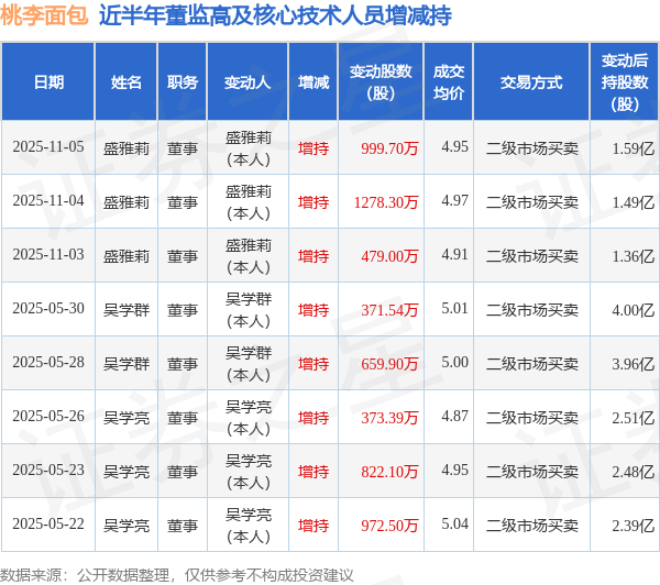 桃李面包:11月5日高管盛雅莉增持股份合计999.7万股