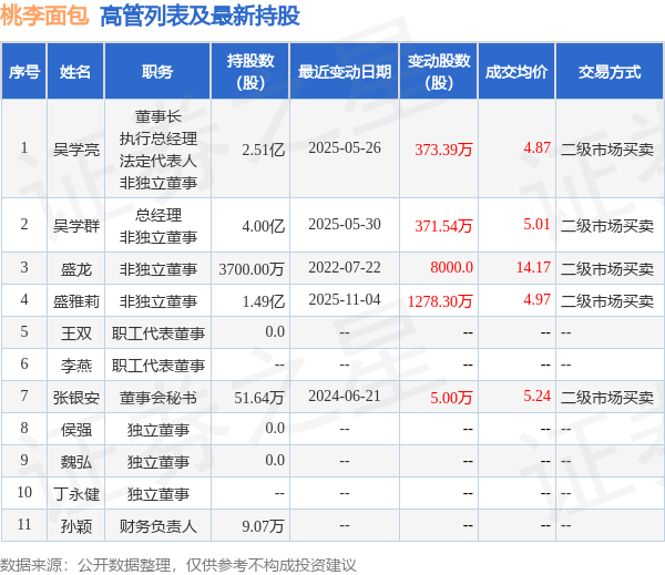 桃李面包近半年内的董监高及核心技术人员增减持详情如下: