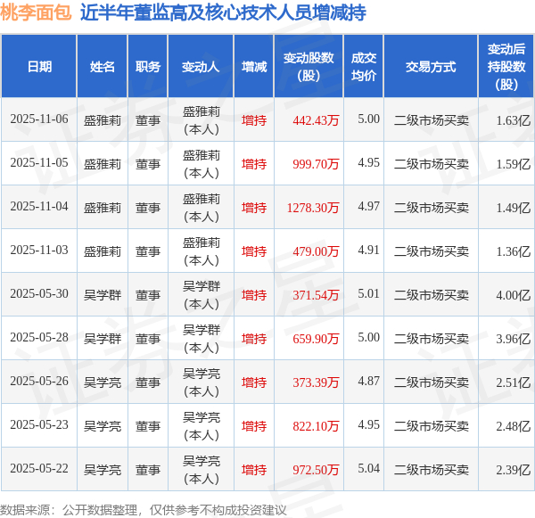 桃李面包:11月6日高管盛雅莉增持股份合计442.43万股