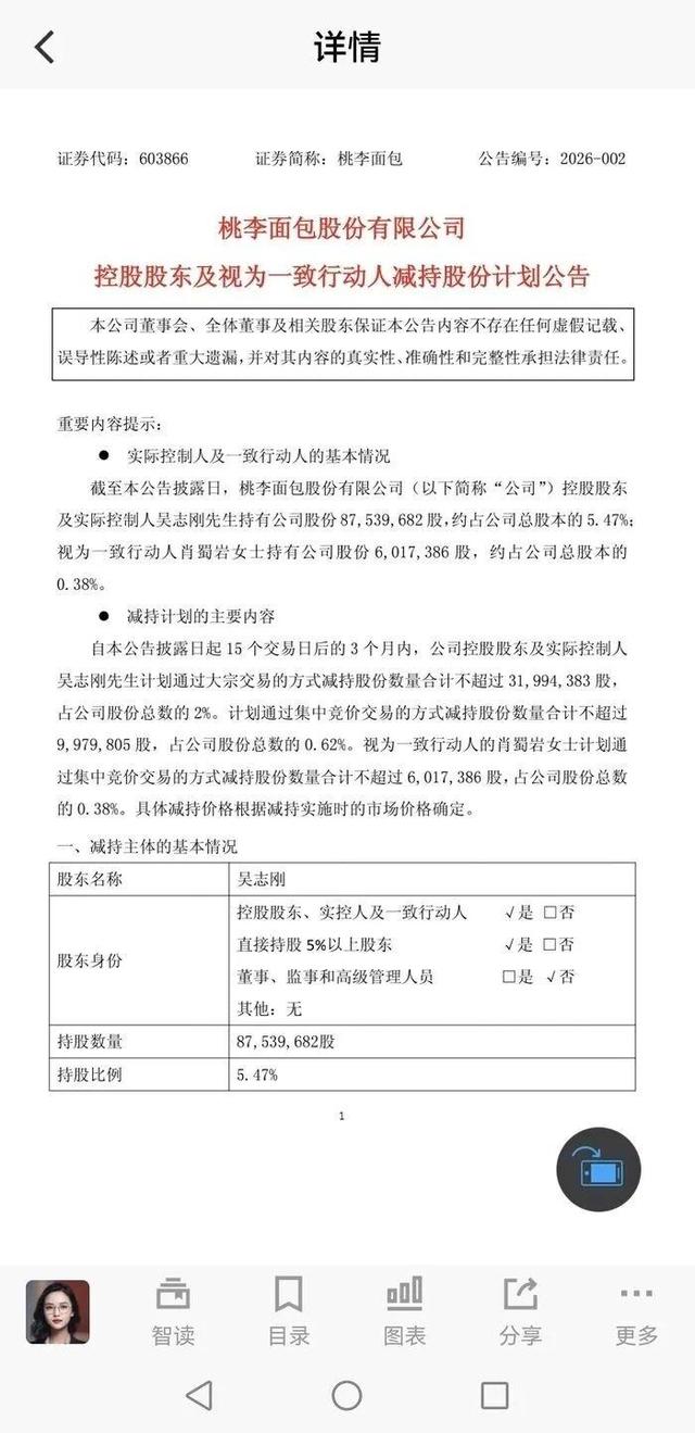 图源 桃李面包官网公告显示,本次减持窗口期为2026年3月19日至6月18日,即公告披露日起15个交易日后的3个月内。其中,吴志刚计划通过大宗交易方式减持不超过3199.44万股(占公司总股本2%),通过集中竞价方式减持不超过997.98万股(占比0.62%),合计减持数量不超过4197.42万股,占公司总股本2.62%。其一致行动人肖蜀岩则计划通过集中竞价方式清仓式减持所持全部601.74万股股份,占公司总股本0.38%。