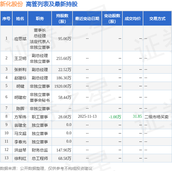 新化股份近半年内的董监高及核心技术人员增减持详情如下: