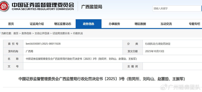 2025年10月13日,广西监管局对为新智认知出具2019年至2021年年度财务报表的中介机构致同所作出处罚。