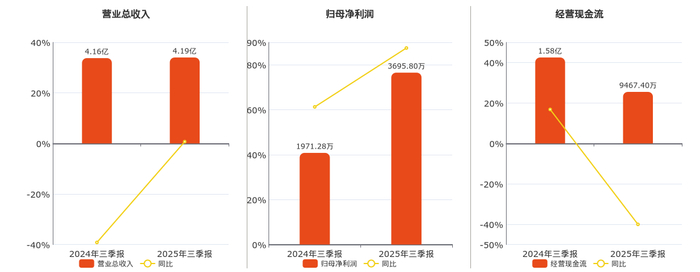 公司营业总收入为4.19亿元,在已披露的同业公司中排名第40。归母净利润为3695.80万元。经营活动现金净流入为9467.40万元,较去年同报告期经营活动现金净流入减少6317.40万元,同比较去年同期下降40.02%。