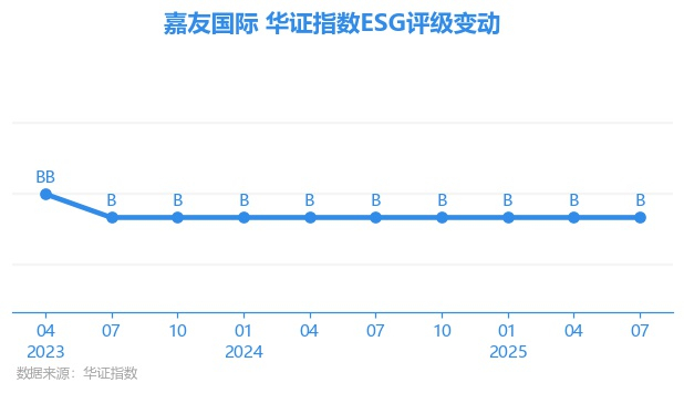 日前,华证指数公布了新一期(2025年7月31日)的ESG评级结果,嘉友国际(603871.SH)获得B评级(华证指数评级为C起至AAA九档,C为最低档,AAA为其最高一级评级/AA为其第二档),上一期(2025年4月30日)ESG评级为B。本期ESG评级在34家航空货运与物流行业A股上市公司中排名第24(上一期排名第23)。